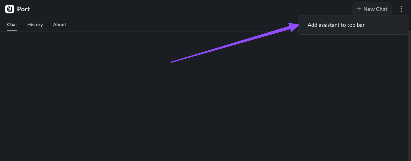 3. For quicker access, add Port to your Slack top bar by clicking the three dots menu and selecting "Add assistant to top bar".