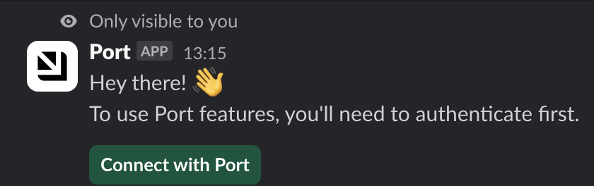 When a new team member first tries to use the Slack app, a private message with a "Connect to Port" button will be sent to them: