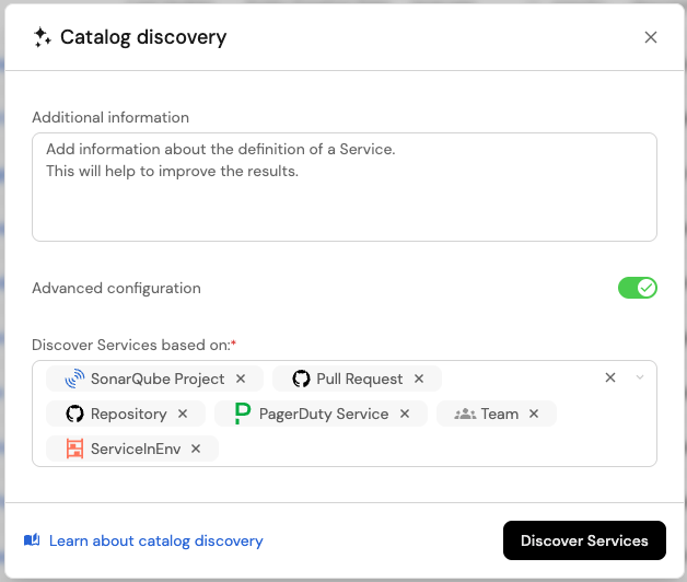 - Services: A service can be identified through various sources such as Jira projects, Snyk projects, PagerDuty services, Sonar projects, or a combination of these. Since no single integration fully represents the service, catalog discovery can analyze these related entities to suggest services.