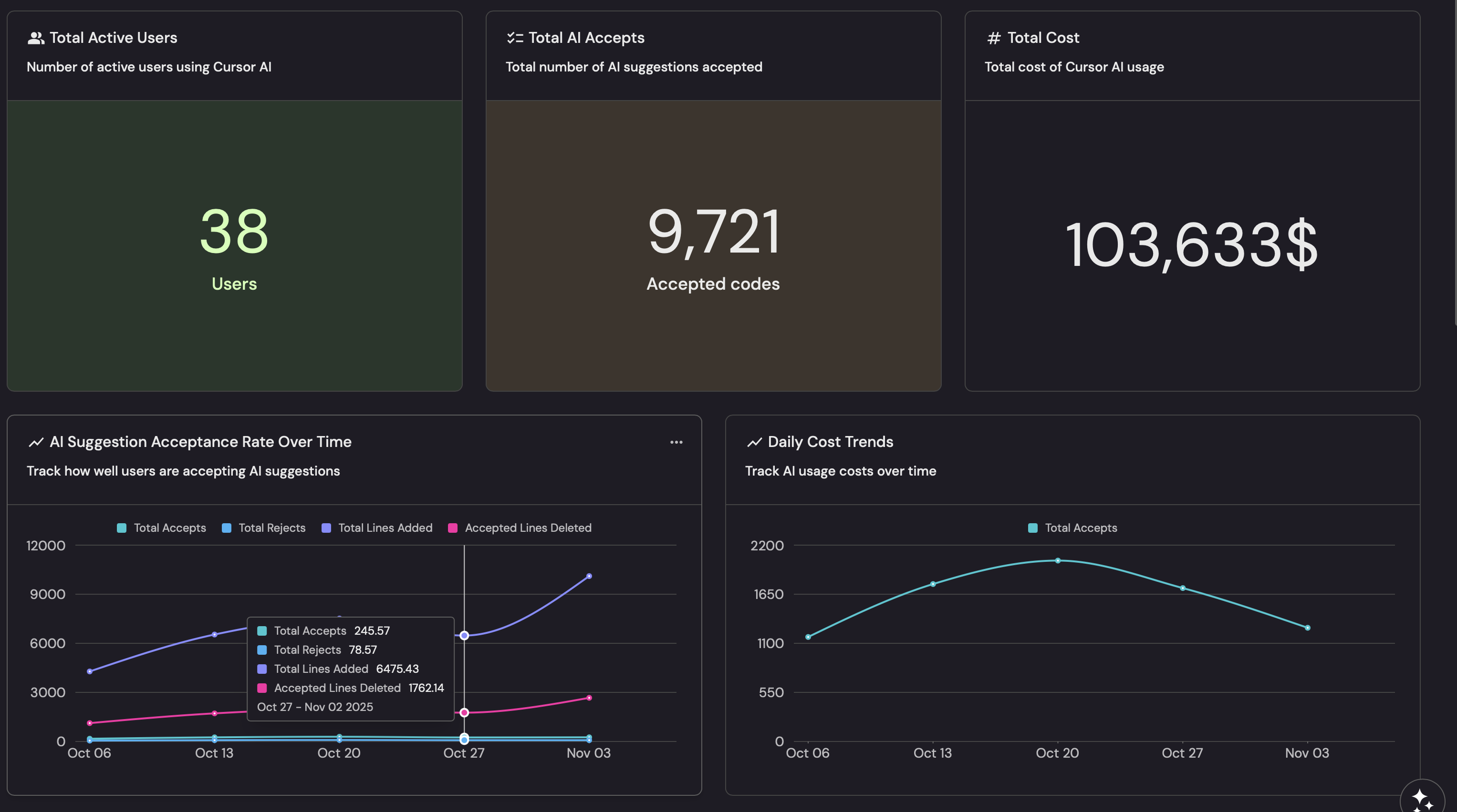 • cursor_ai_code_change_record - Daily AI-generated code changes from /analytics/ai-code/changes.