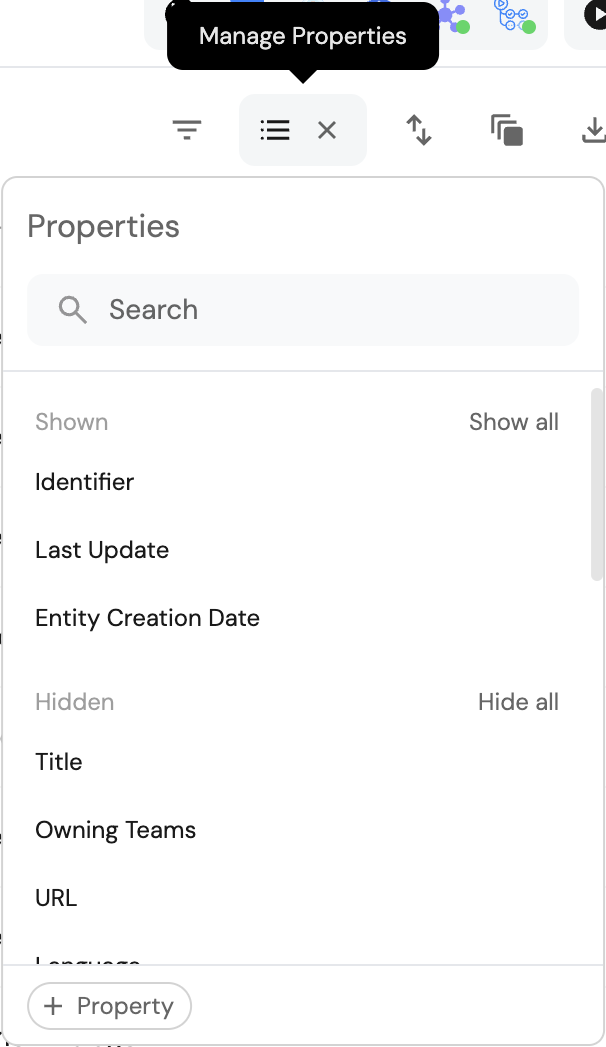 You can show/hide properties by using the Manage Properties option in the top-right corner of the table: