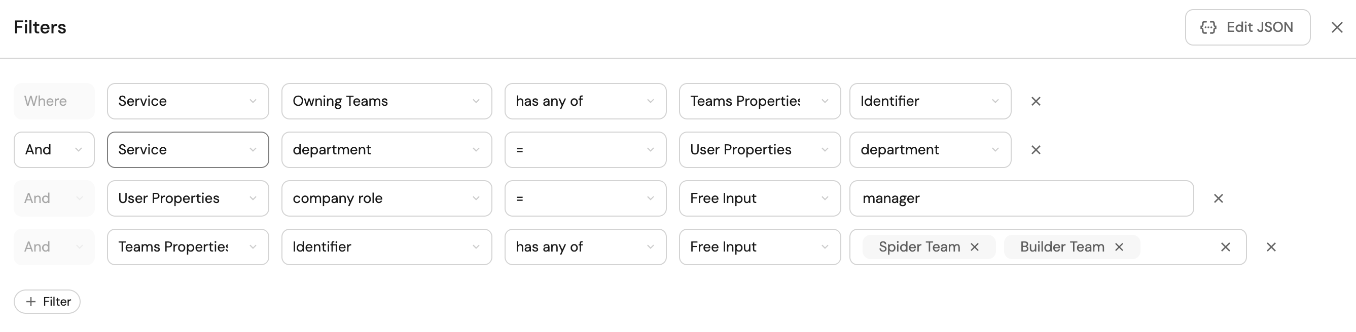 and- will apply a logical AND operation between all rules, requiring all of them to satisfy for a given asset in order to return it.or- will apply a logical OR operation between all rules, requiring at least one of them to satisfy for a given asset in order to return it.